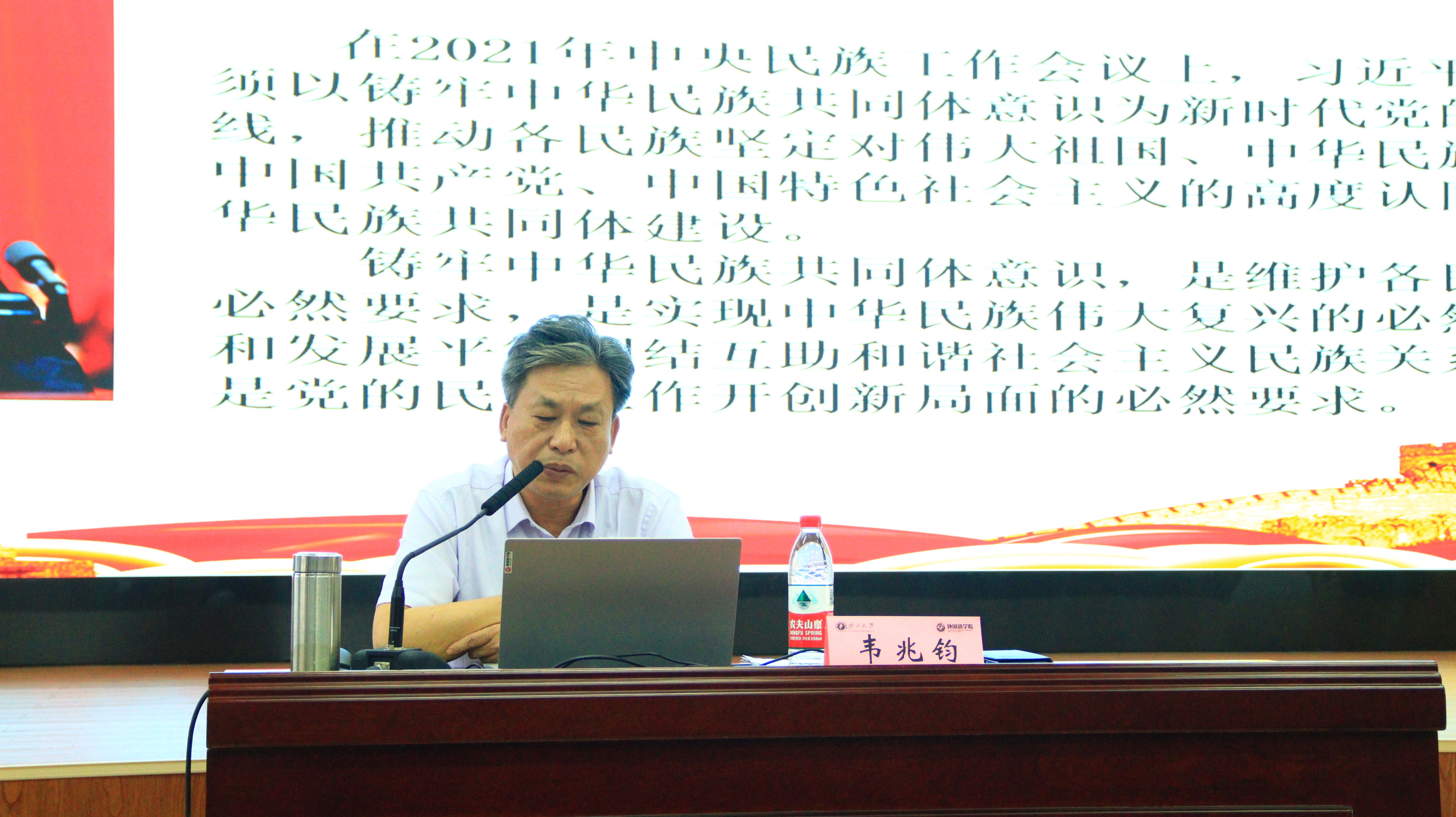 韦兆钧教授向老师同学们讲解“中华民族共同体”这一概念提出的历史背景,剖析了“中华民族共同体”的具体内涵;系统的用八个“坚持”和三个“启示”讲解了新时代铸牢中华民族共同体意识的行动指南包括哪些方面;最后从理想信念、不忘初心、牢记使命和提升自身综合能力三个方面论述了如何铸牢中华民族共同体意识。